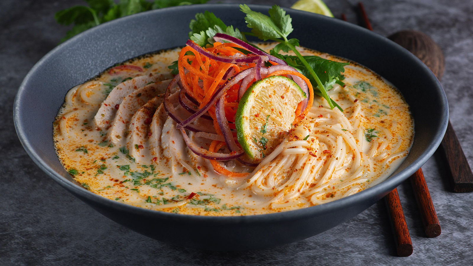 4. Pour the boiling soup over the noodles in your serving bowls, add a squeeze of lime juice and your garnishes, and serve. The noodles will be ready to eat in a couple of minutes.